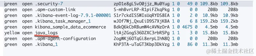 在运行完上面的命令后,我们使用如下的命令来检查已经生产的索引 java_logs:
