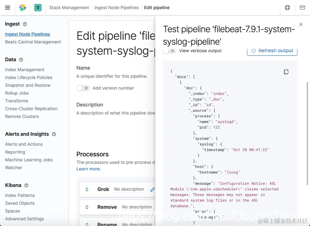 我们可以看到上面的输出。从上面我们可以看出来这个 ingest pipeline 能够正确地分析 system.log/syslog 信息。