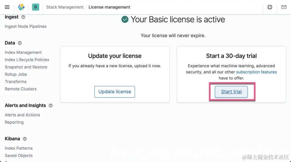 这个用来设置一下机器学习的配置。机器学习是白金版的功能。我们必须打开30天试用才可以使用: