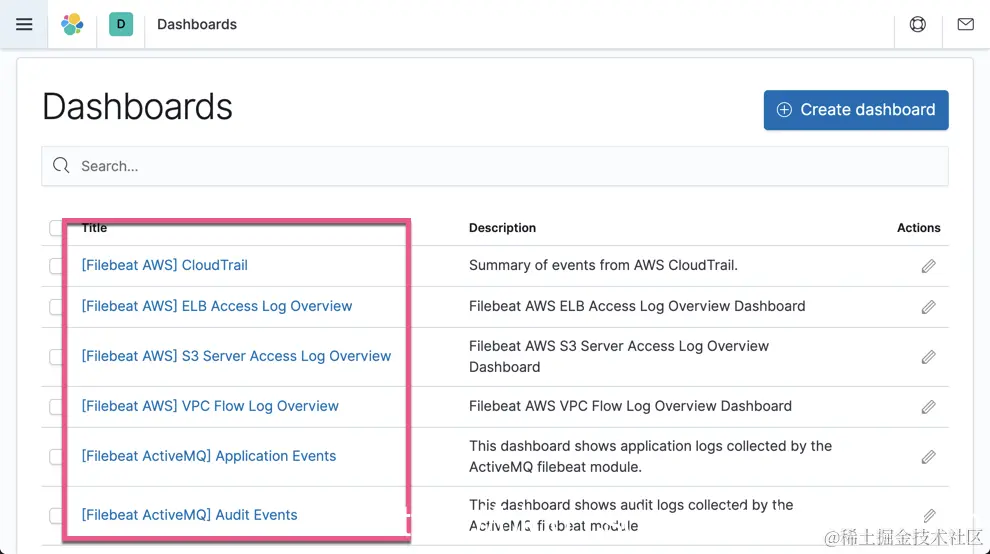 在执行完 setup 命令后,我们可以在 Dashboards 中发现已经帮我们生产好的 Dashboard 来供我们使用。