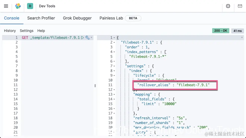 我们从上面可以看出来这个 index template 里有一个 rollover_alias 叫做 filebeat-7.9.1。我们可以通过如下的方式来查看: