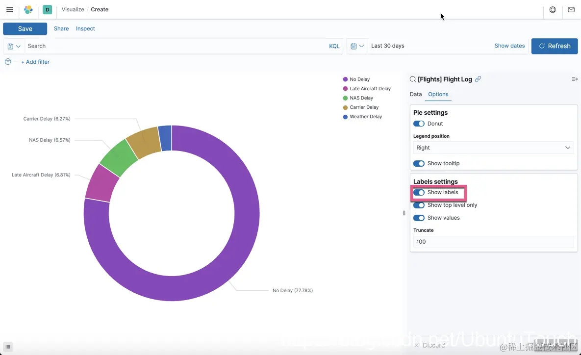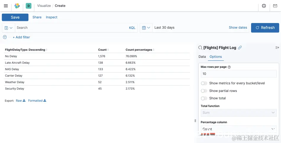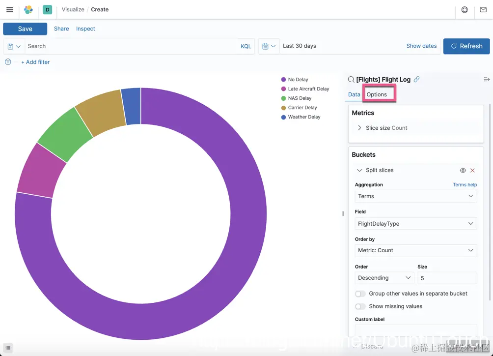 这些可视化针对 FlightDelayType 字段应用 Terms 桶聚合,将每个桶中的数量转换为占总值的百分比并显示出来。在 flights 样本数据中,字段 FlightDelayType 仅有 6 个唯一值,所以将 Terms 的数量设置为 6 或更大时,显示的百分比是准确的。如果数据中有更多的唯一值,您需要启用“Other”桶,以便涵盖所有数据:
