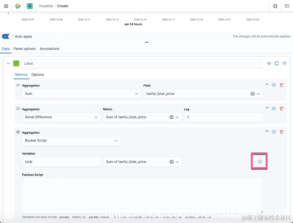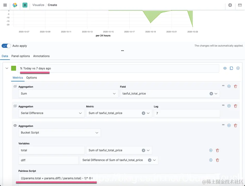 所用的 Painless 脚本为 (((params.total + params.diff) / params.total) - 1)*100。