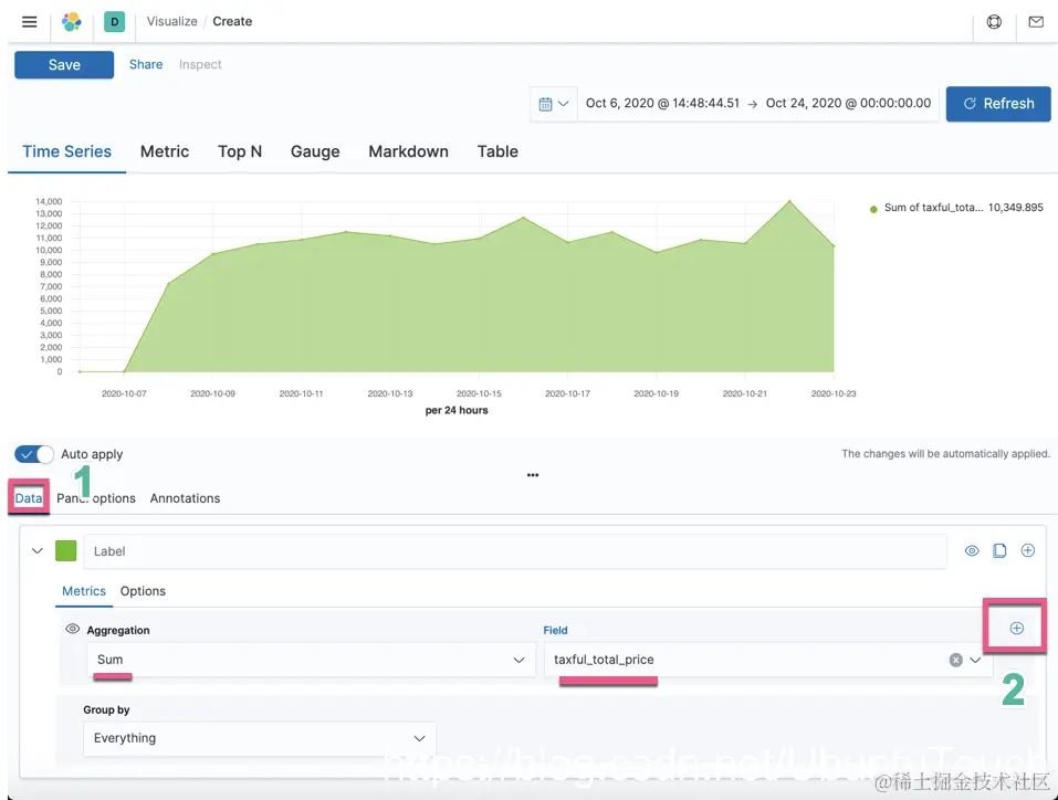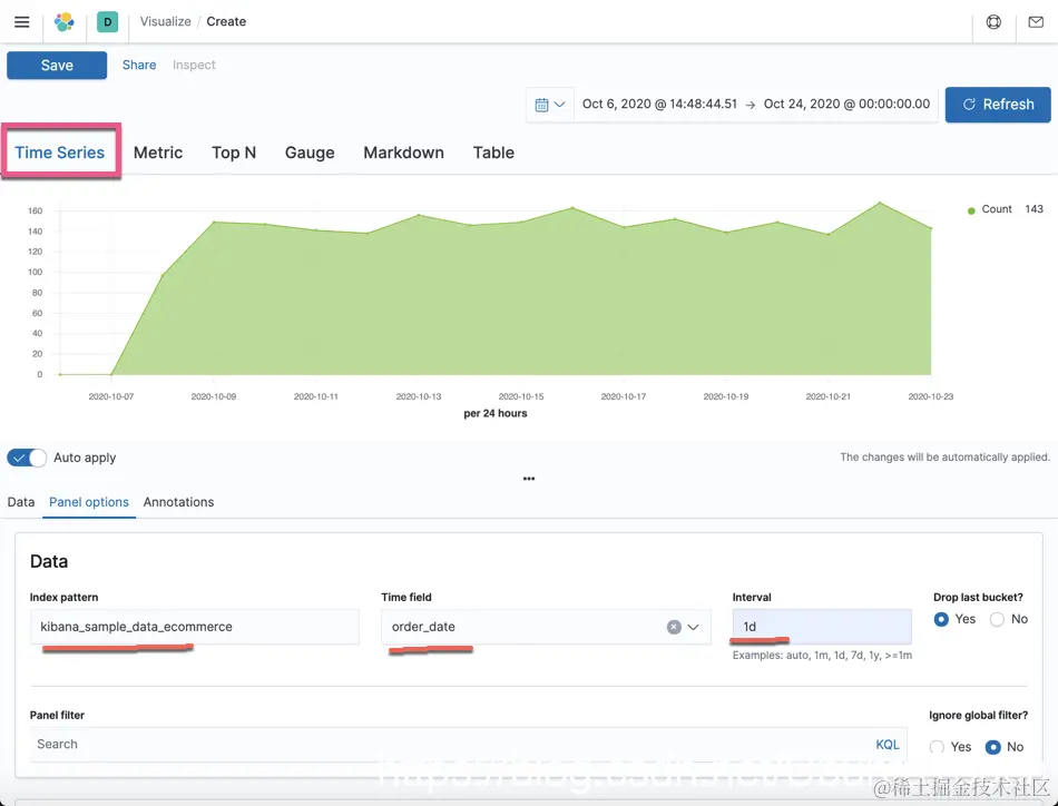 和前面的例子一样,设置 TSVB,确保选择 kibana_sample_data_ecommerce 索引,并将 Time field 设置为 order_date。同时,还要将间隔准确设置为 1d。TSVB 中的默认间隔会基于整体时间范围而变化,而此次的计算需要将间隔时间设为固定值。