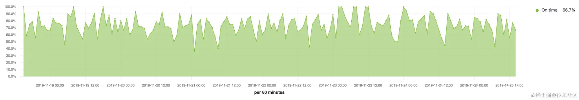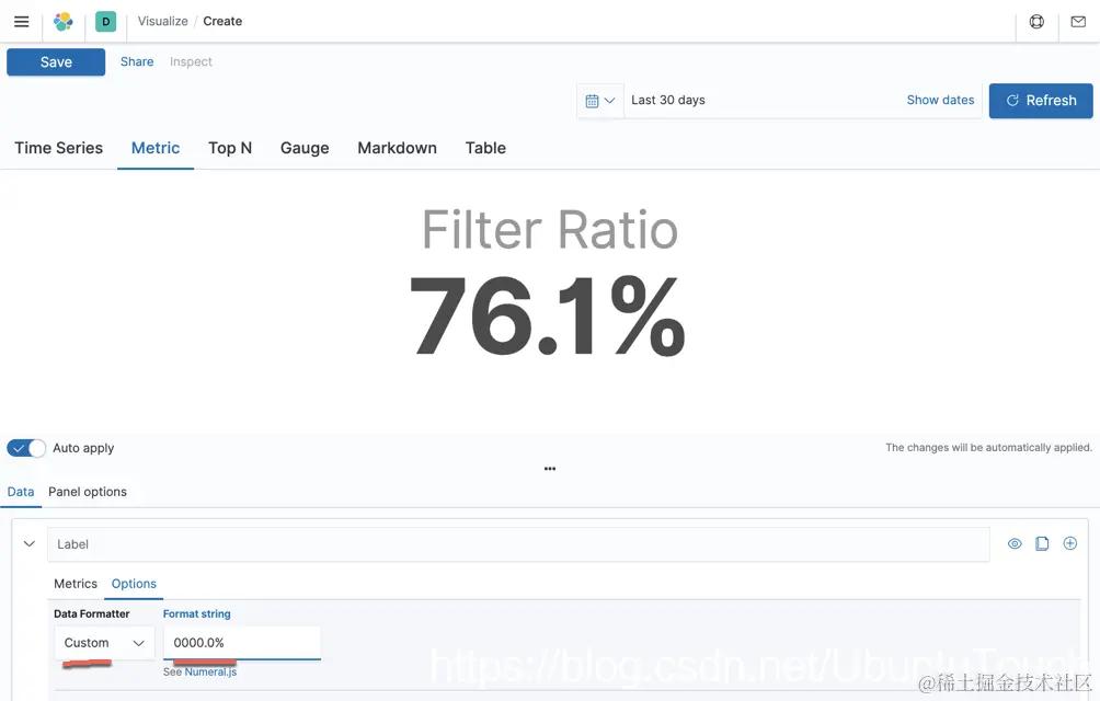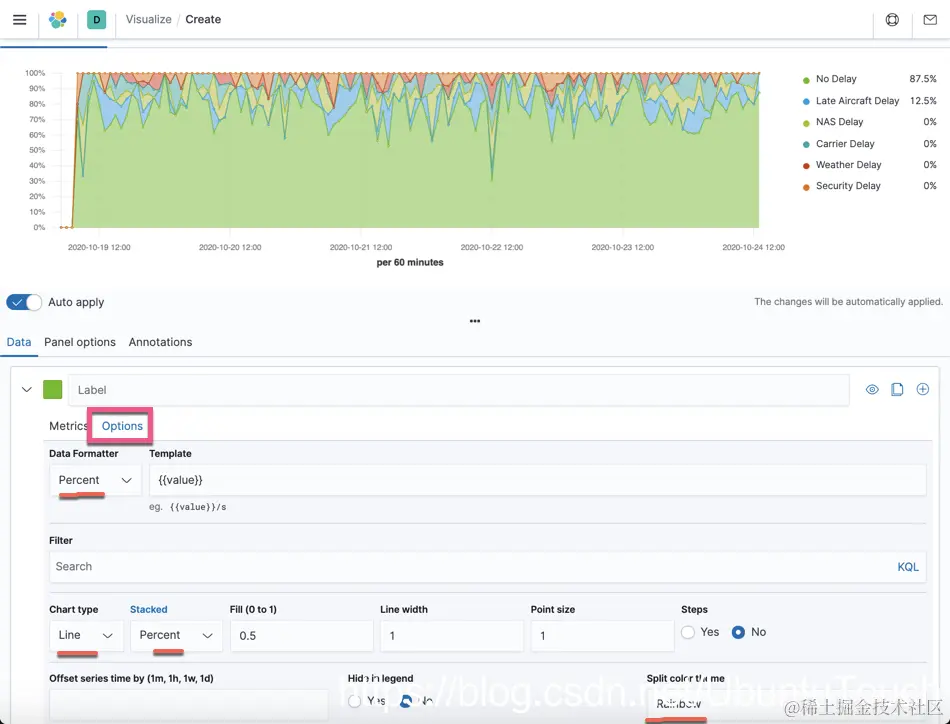 由于航班文档中有时间字段,TSVB 是创建可视化的最得力工具。仍然使用上面的设置,您可以使用 Filter Ratio 来针对每个时间间隔计算“No Delay”(无延迟)航班除以总航班数量的值: