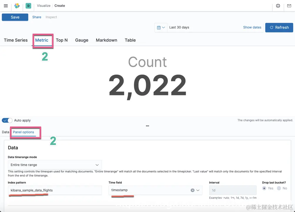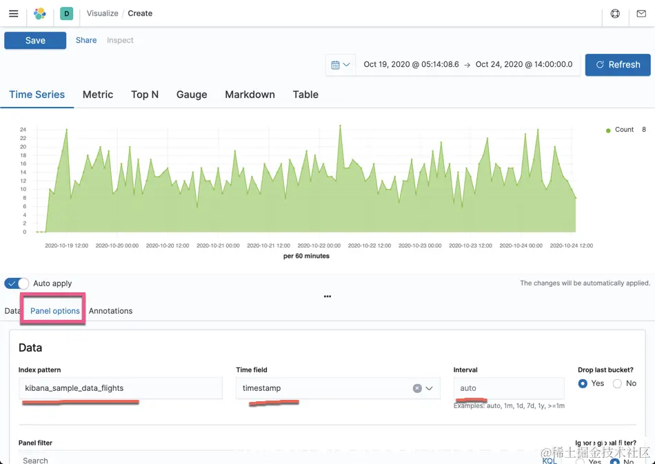 - 前往 TSVB,选择 Panel options,然后输入 kibana_sample_data_flights 作为索引。
