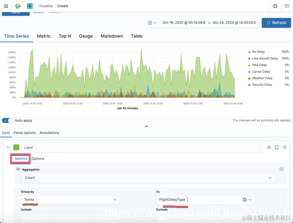 - 在 Group by 下面,为 FlightDelayType 选择 Terms。
