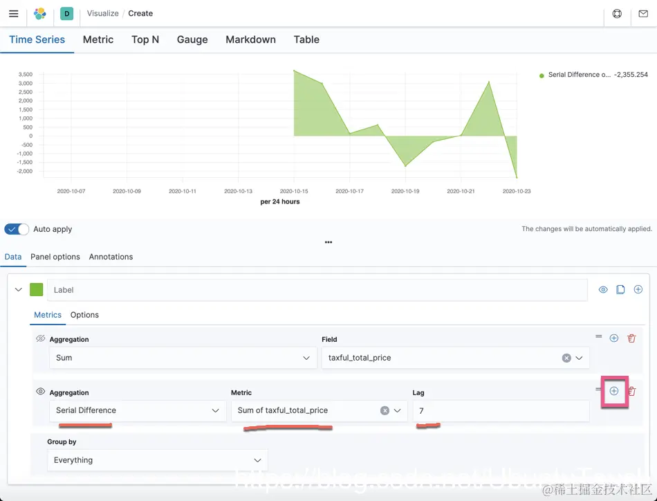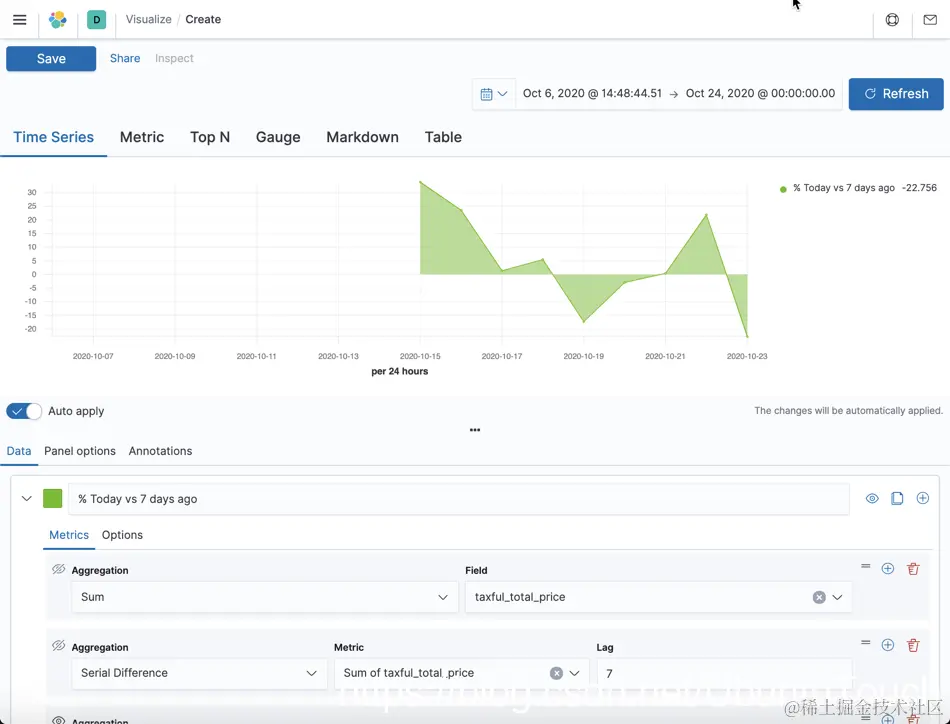 然后,针对 Sum of taxful_total_price 添加一个 Serial Difference 聚合,记得要设为相差 7 个桶,因为您已将时间间隔设置为 1 天。Serial Difference 会从每天的值中减去 7 个桶之前的那天的值,从而得出销售额周同比的总差额。由于 Serial Difference 指标的计算方式,它始终会将左边的 7 天留空,所以您应该选择一个较大的时间范围:
