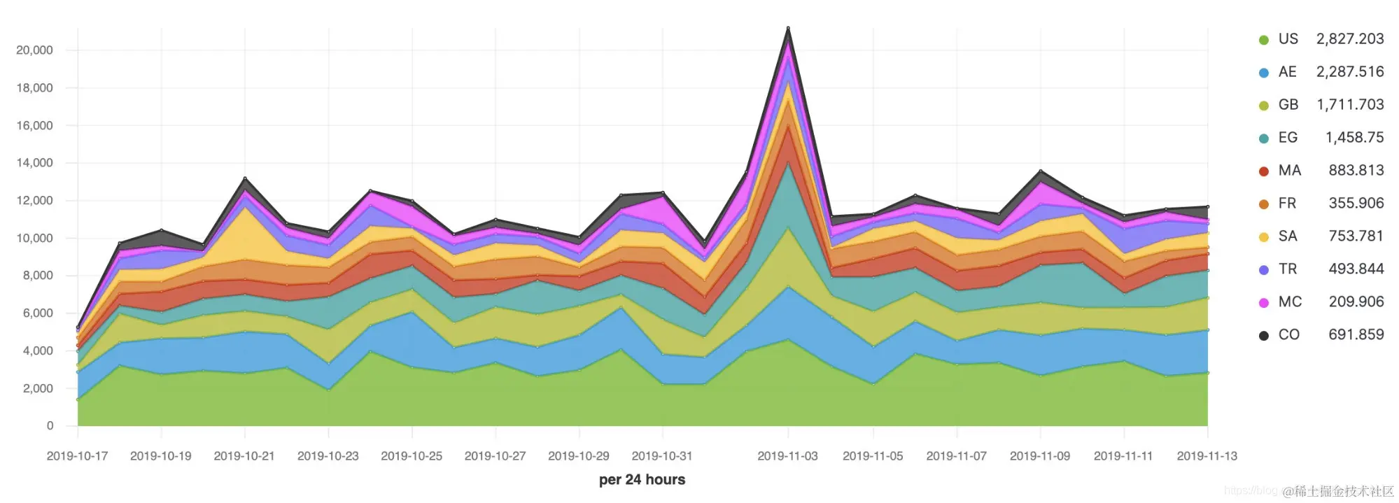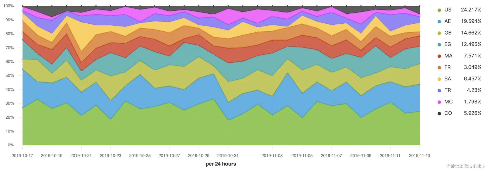 要对比多于一项时序数据,您既可创建多个 Filter ratio,也可以使用聚合来选择群组。TSVB 有一个模式可用来展示多个时序,总比例为 100%。