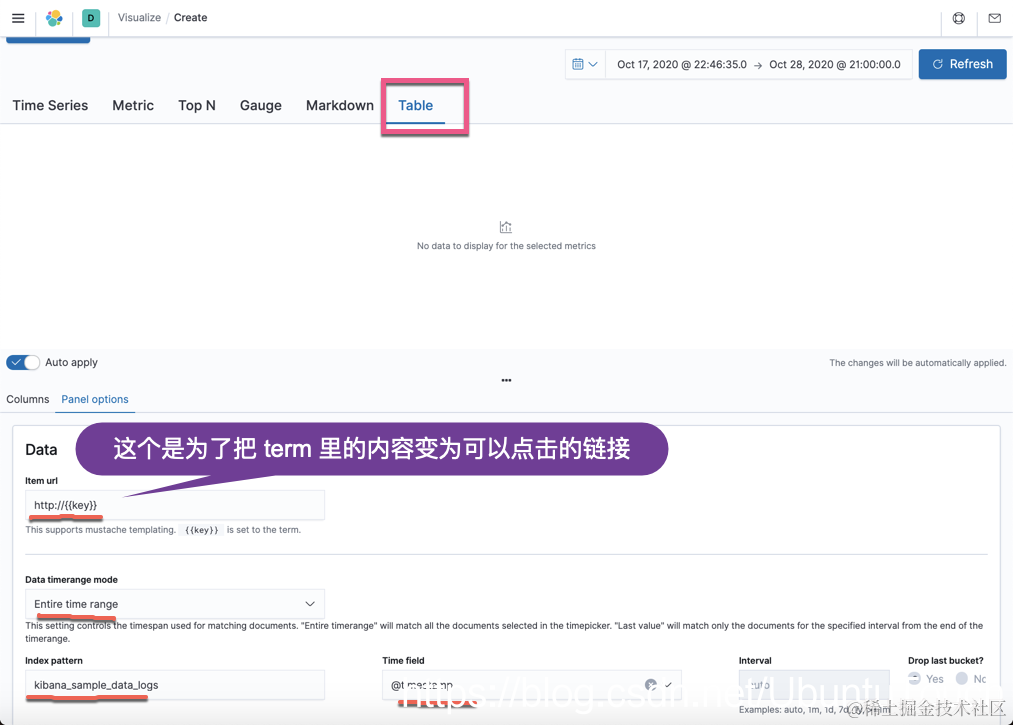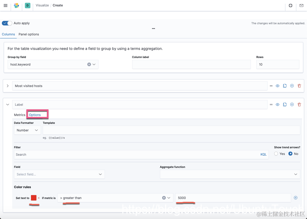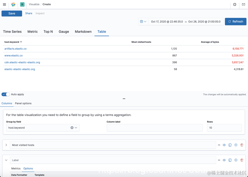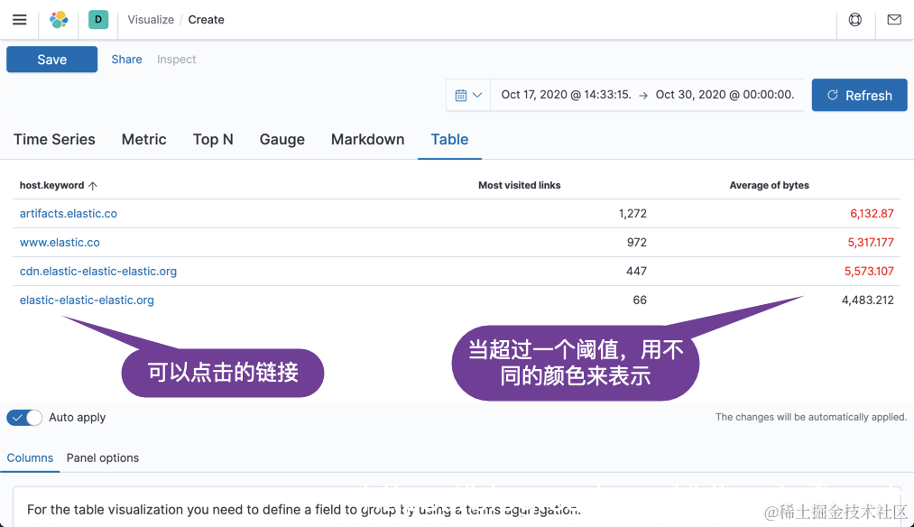 在上面的可视化中,我们可以看到尽管它能展示一些数据,但是在某些时候,我们希望展示的数据能给予我们一目了然的结果,比如当 average bytes 超过一个数据时,我们希望用一种颜色来标识出来。这样可以让我们知道是不是有异常等等。显然正常的 table 可视化不能完成这种目的。那么我们怎么办呢?我们可以使用 TSVB 中的 table 来达到这个目的。