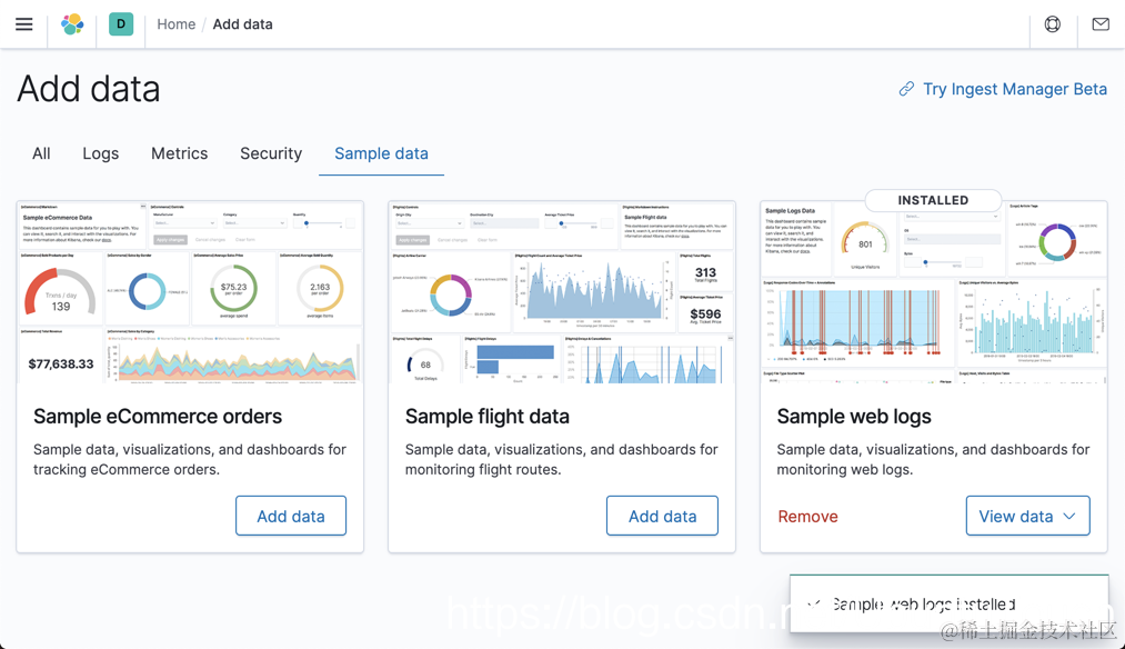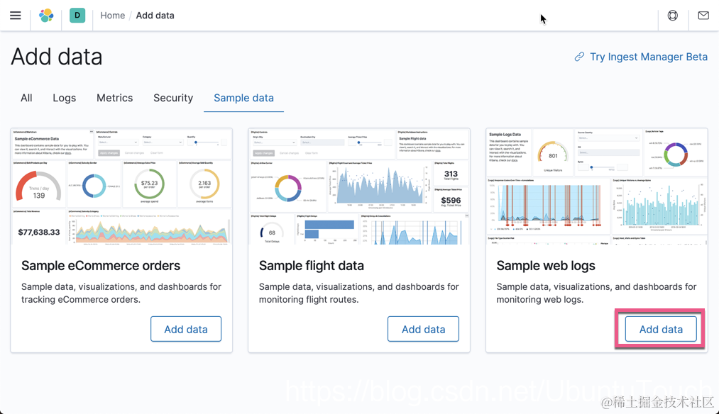 在今天的展示中,我们将使用 Kibana 自带的数据来做演示。打开 Kibana: