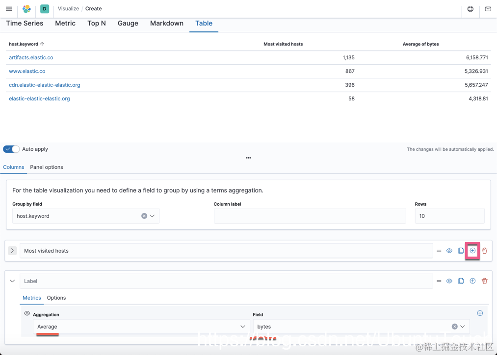 在 Group by field 处选择 host.keyword。这样就形成了我们的表格,但是这里只有两个列。我们点击右边的加号 +: