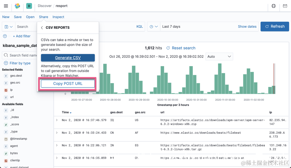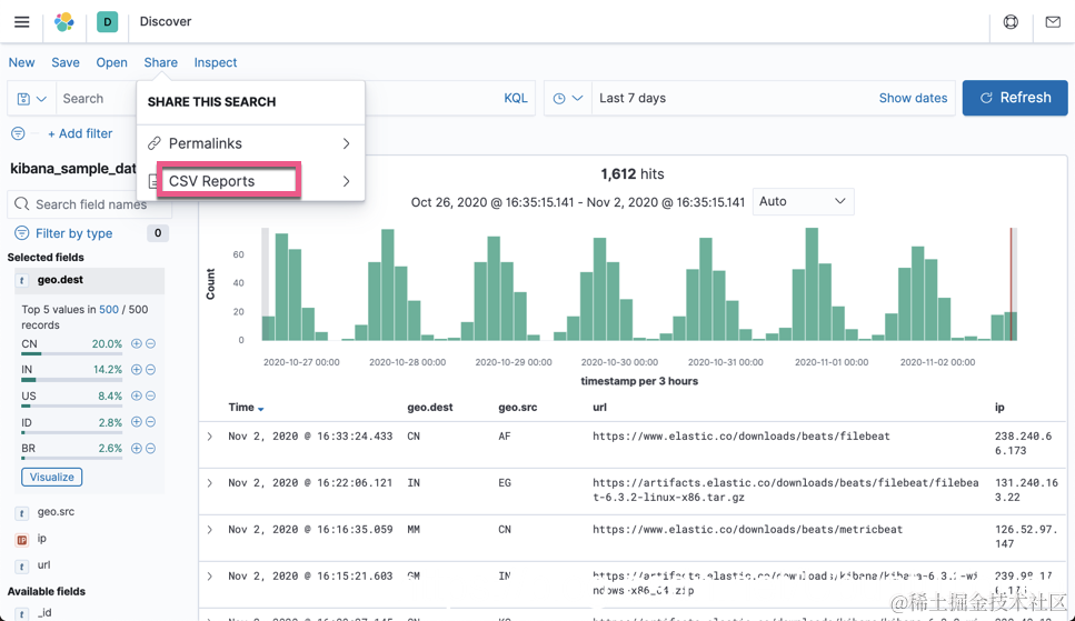 - 在 Kibana 工具栏中,单击共享,然后选择 CSV 报告