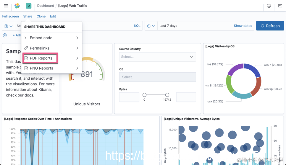 - 在 Kibana工具栏中,单击 share,然后选择 PDF 报告