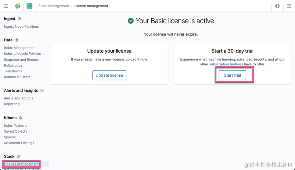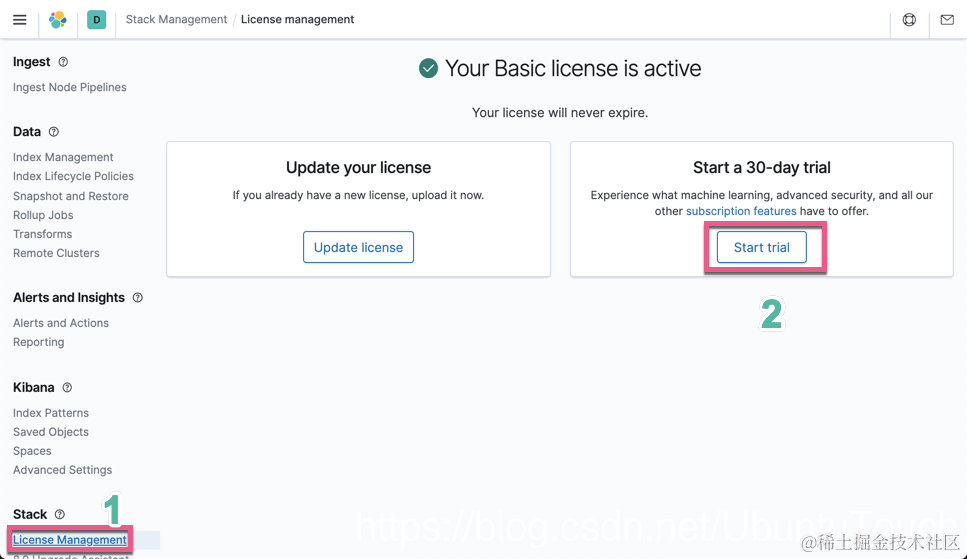 由于 Watcher 是一个白金版的功能,在使用 watcher 之前我们必须启动 30 天测试来进行演示。你可以通过如下的方式来进行启动: