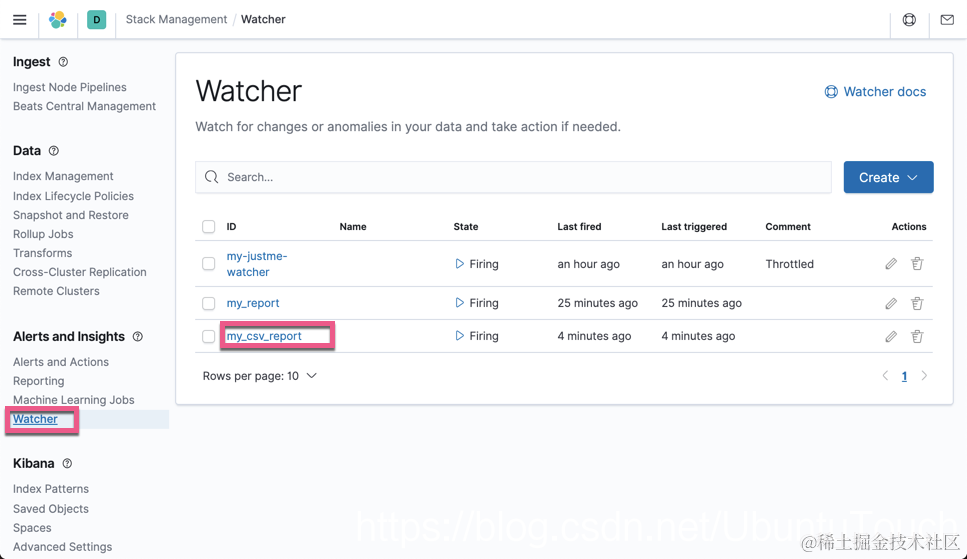 经过上面的命令执行后,你可以在 Kibana 的 watcher 列表中看到这个 watcher: