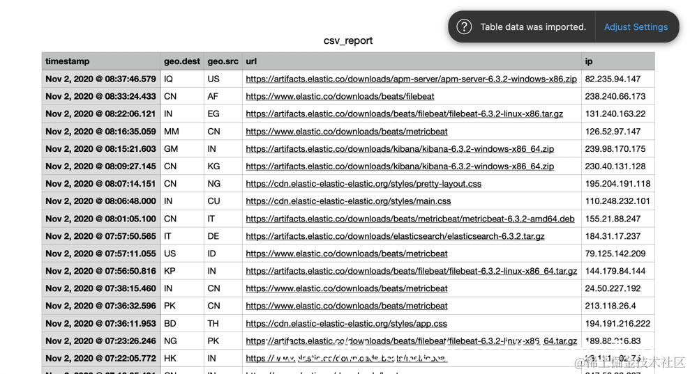 "url": "http://localhost:5601/api/reporting/generate/csv?jobParams=%28browserTimezone%3AAsia%2FShanghai%2CconflictedTypesFields%3A%21%28%29%2Cfields%3A%21%28timestamp%2Cgeo.dest%2Cgeo.src%2Curl%2Cip%29%2CindexPatternId%3A%2790943e30-9a47-11e8-b64d-95841ca0b247%27%2CmetaFields%3A%21%28_source%2C_id%2C_type%2C_index%2C_score%29%2CobjectType%3Asearch%2CsearchRequest%3A%28body%3A%28_source%3A%28includes%3A%21%28timestamp%2Cgeo.dest%2Cgeo.src%2Curl%2Cip%29%29%2Cdocvalue_fields%3A%21%28%28field%3Atimestamp%2Cformat%3Adate_time%29%29%2Cquery%3A%28bool%3A%28filter%3A%21%28%28match_all%3A%28%29%29%2C%28range%3A%28timestamp%3A%28format%3Astrict_date_optional_time%2Cgte%3A%272020-10-26T08%3A39%3A06.925Z%27%2Clte%3A%272020-11-02T08%3A39%3A06.925Z%27%29%29%29%29%2Cmust%3A%21%28%29%2Cmust_not%3A%21%28%29%2Cshould%3A%21%28%29%29%29%2Cscript_fields%3A%28%29%2Csort%3A%21%28%28timestamp%3A%28order%3Adesc%2Cunmapped_type%3Aboolean%29%29%29%2Cstored_fields%3A%21%28timestamp%2Cgeo.dest%2Cgeo.src%2Curl%2Cip%29%2Cversion%3A%21t%29%2Cindex%3Akibana_sample_data_logs%29%2Ctitle%3Aresport%29",