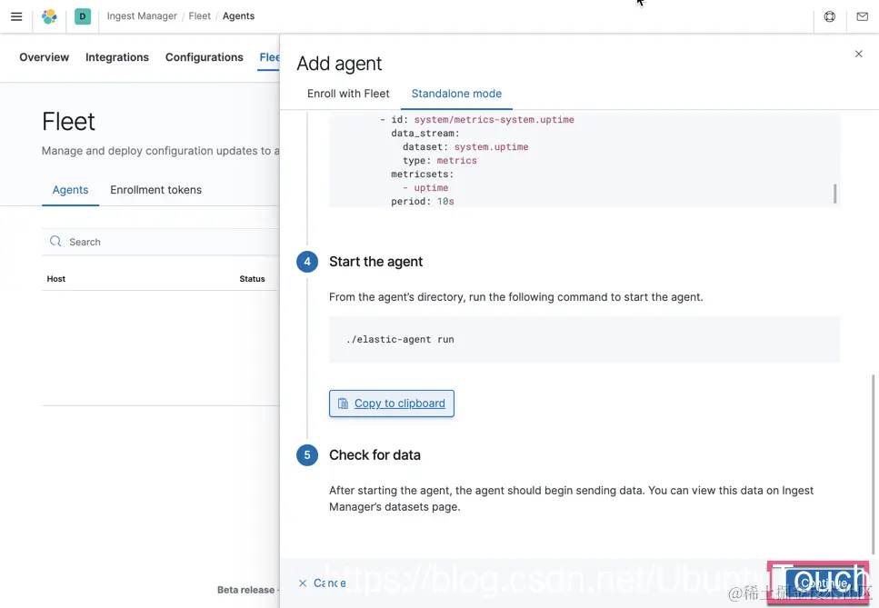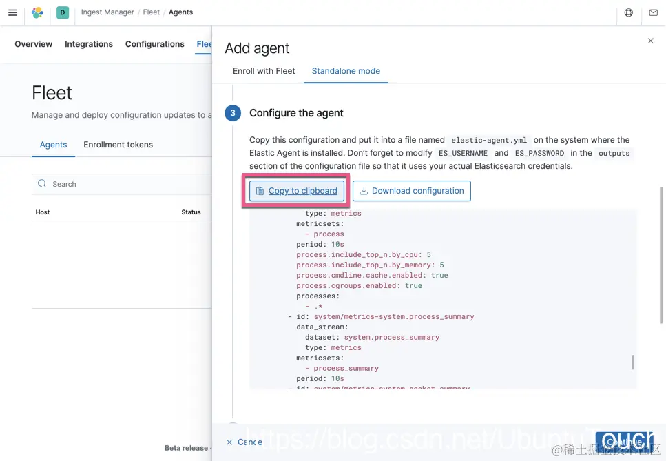 - 复制 agent 程序配置的内容,并将其放入安装了 Elastic Agent 的系统上的名为 elastic-agent.yml 的文件中