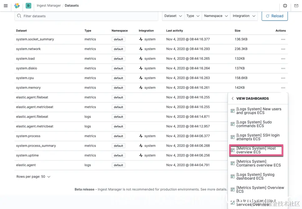 点击上面的 Datasets。我们选择自己喜欢的 dashboard 来查看:
