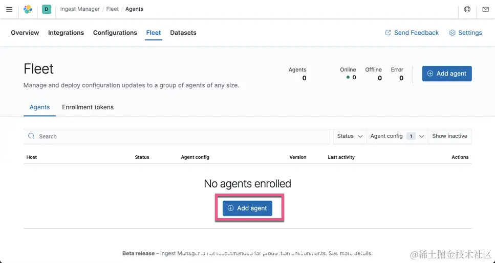 等我们配置好上面的文件后,重新启动 Elasticsearch 及 Kibana。我们再重新点击 Fleet 链接: