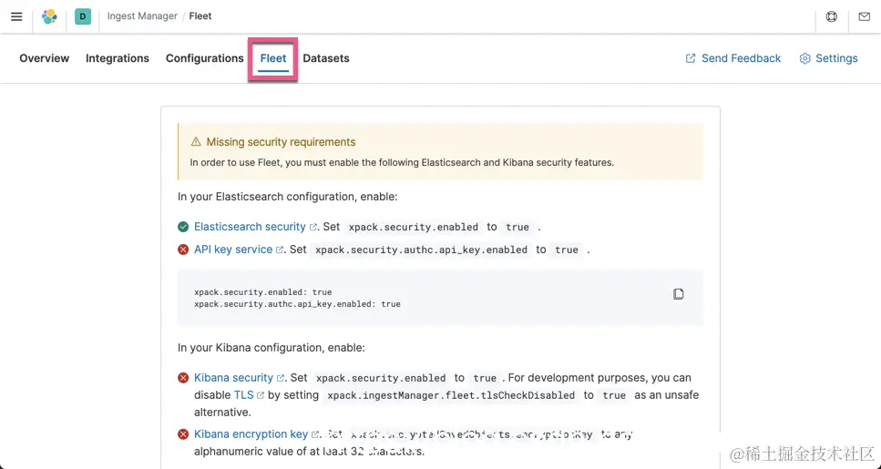 我们点击 Fleet 页面。我们可以看到一些额外需要配置的事项。我们可以参考之前的文章 “使用 Elastic Agent 和 Ingest Manager 简化数据导入 (二)” 进行相应的配置。我在 Kibana 的配置文件 config/kibana.yml 中做了如下的配置: