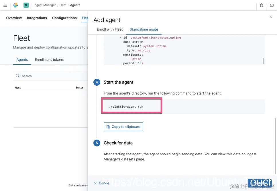 请注意:Ingest Manager 生成的配置文件已经包含用于设置的正确 Elasticsearch 地址和端口。 如果你在本地运行所有内容,则地址为 127.0.0.1:9200。