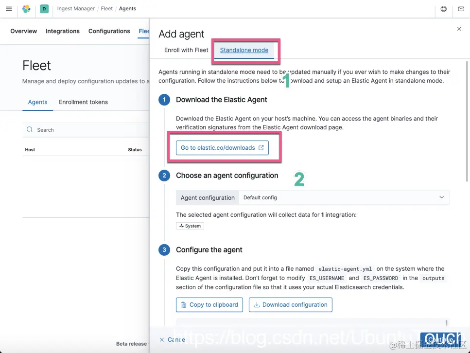 我们点击 Standalone mode,并点击 Go to elastic.co/downloads 去下载 Elastic Agent。我们根据自己的平台选择合适的安装包: