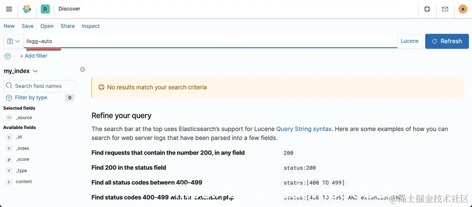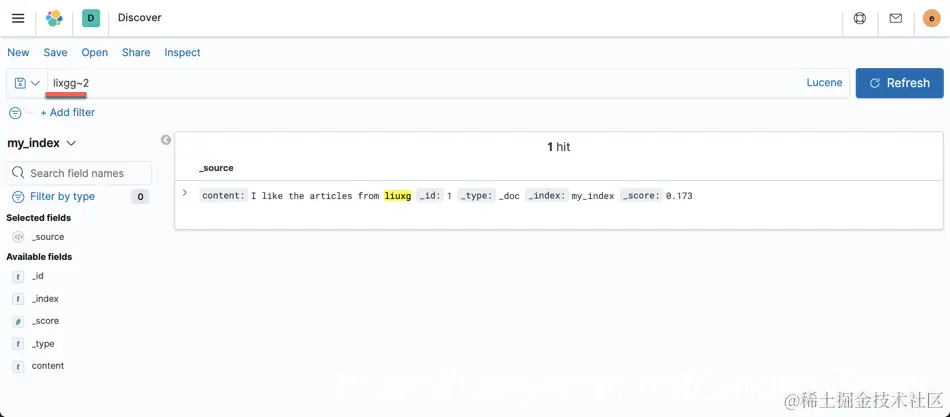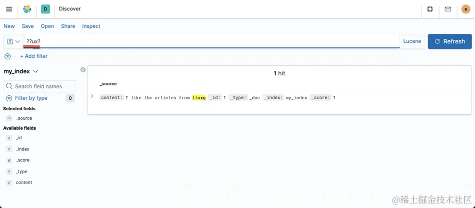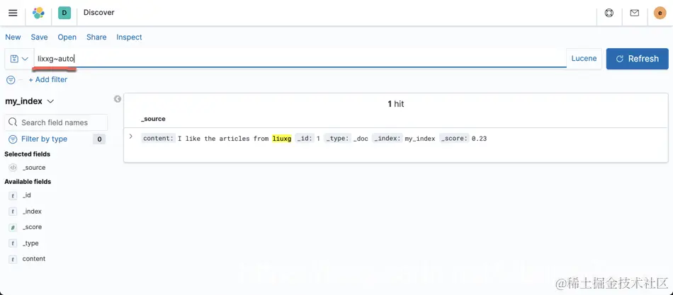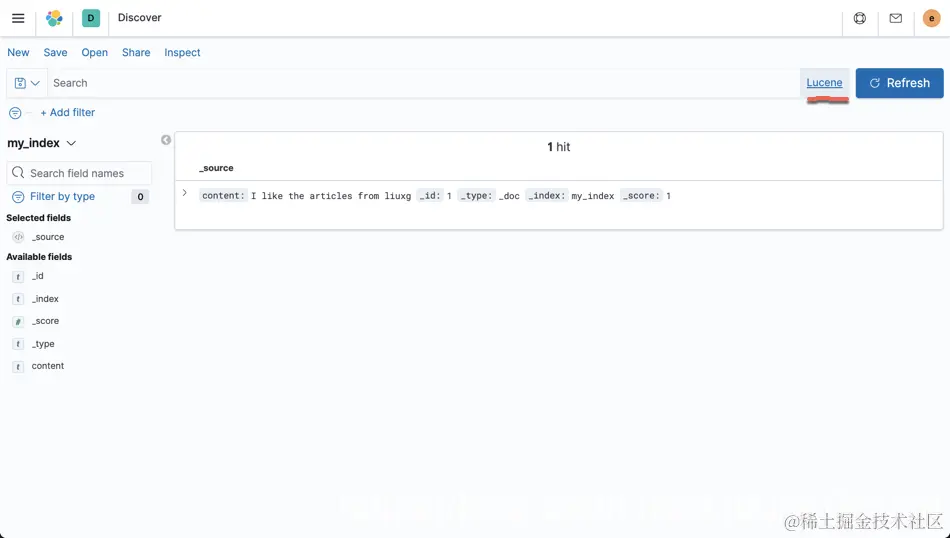 我们打开 Discover,并装载 my_index 索引模式。我们首先切换到 Lucene 搜索模式: