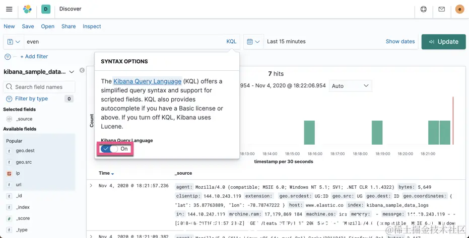 - KQL 搜索,你可以参照我之前的文章 “Kibana: 如何使用 Search Bar”