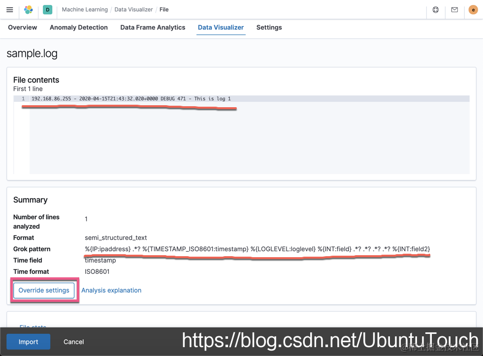 从上面我们可以看出来。机器学习帮我们自动完成了一个 Grok pattern 来解析我们的日志。我们如果对这个不太满意的话,我们可以对这个 pattern 进行一些修改。关于这个 Grok pattern, 你可以参照我之前的文章 “Logstash:如何逐步构建自定义 grok 模式”,虽然它是针对 Logstash 的。我们点击上面的 Override settings: