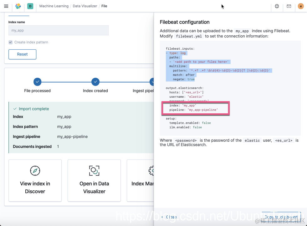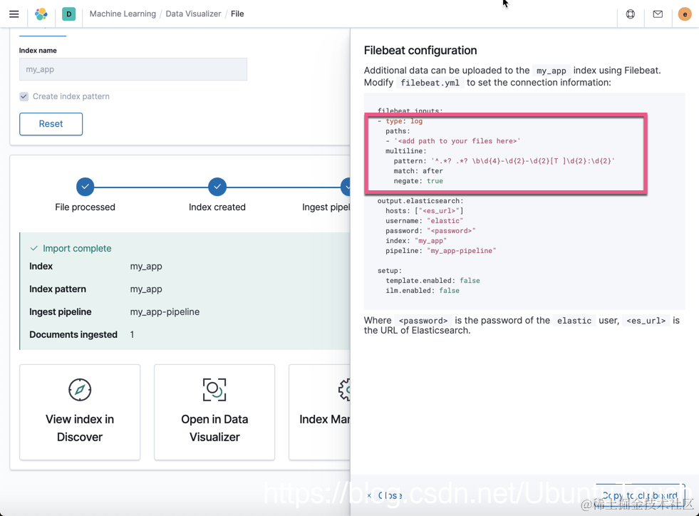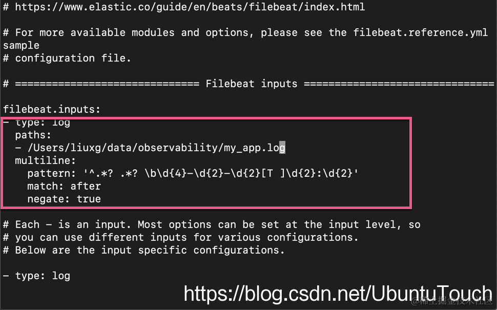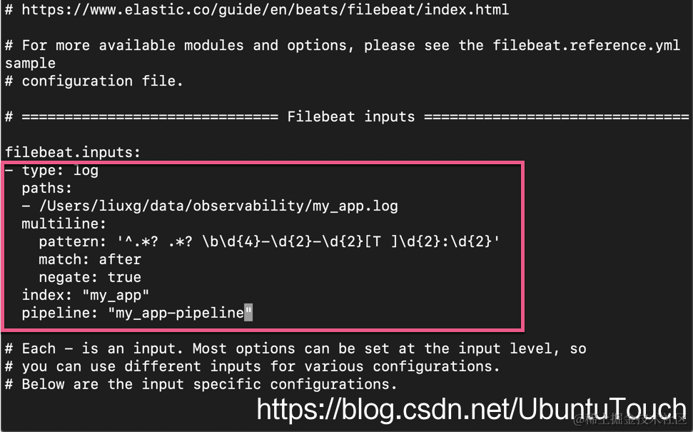 请注意上面的红色框住的部分,这个就是拷贝过来的代码。它被置于 filebeat.inputs: 之下。我们同时需要根据自己的 my_app.log 的路径进行修改 paths。为了能够得日志能够导入到 Elasticsearch 中,我们还必须定义 index 以及 pipeline。我们拷贝如下的两行: