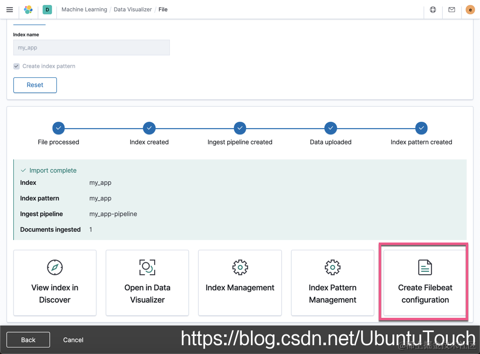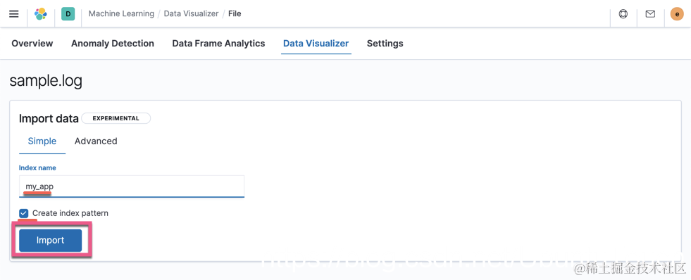 我们填入 my_app 作为 index name,并点击 import 按钮: