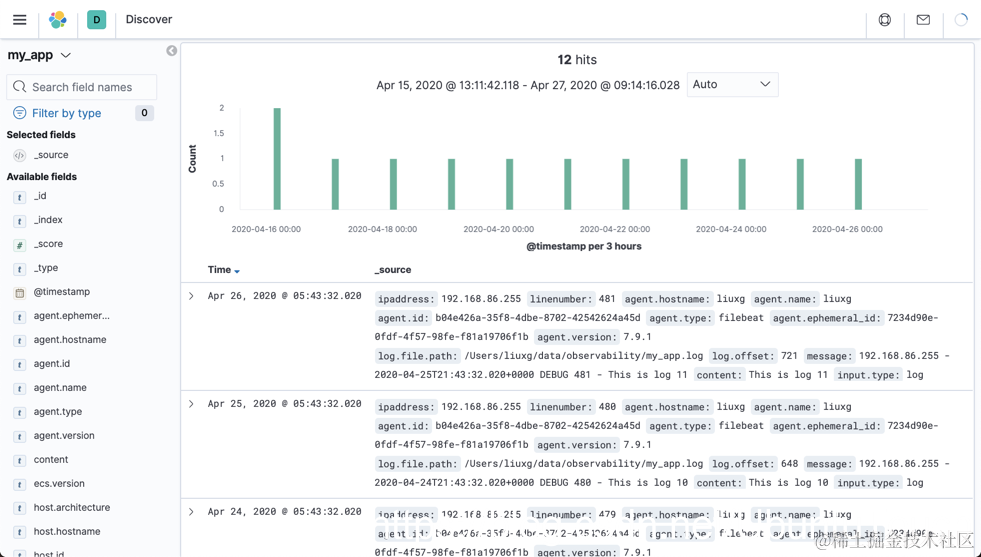 也就是说它有12个文档。我们也可以在 Discover 中进行查看。