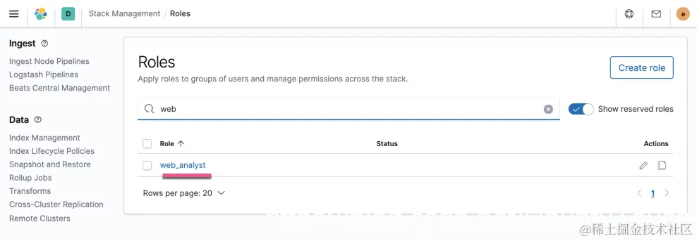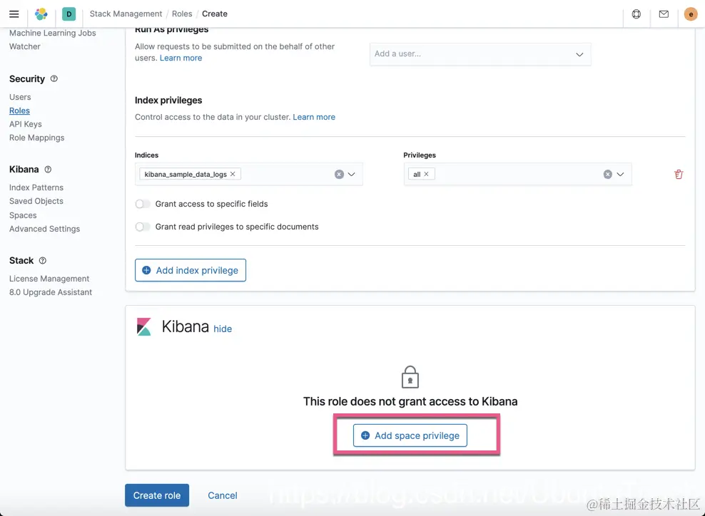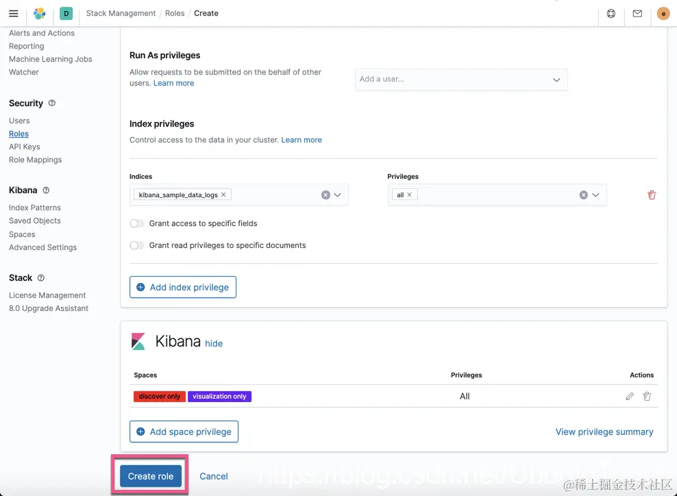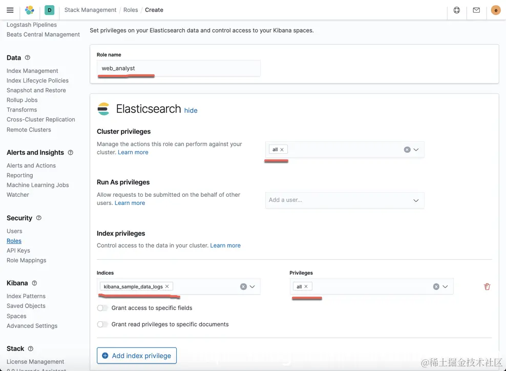 在上面,我们定义了一个叫做 web_analyst 的 role。它作用于 kibana_sample_data_logs 上。这个索引也是 Kibana 自带的三个索引之一。我们把屏幕向下翻动: