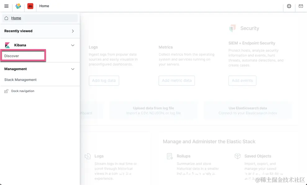 从上面,我们可以看到只有 Discover 这个菜单是可以用的。