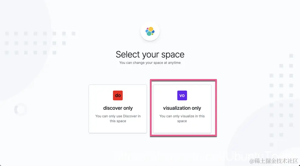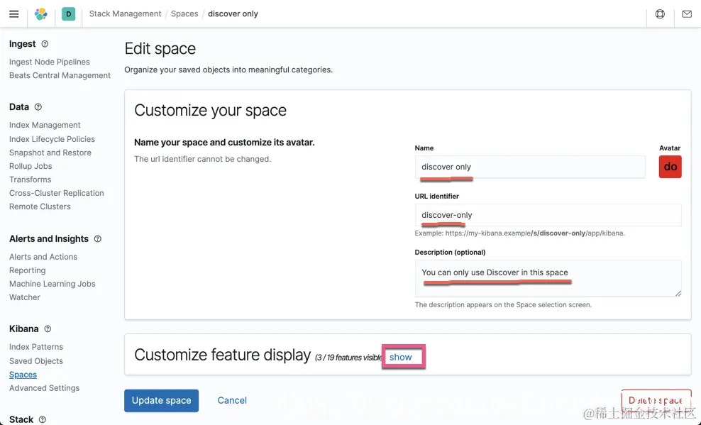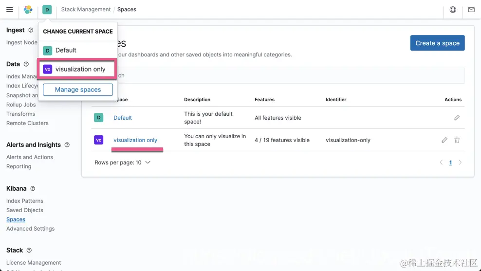 点击上面的 Create space,这样我们就创建了一个叫做 discover only 的 Space。你可以选择一个和 visualization only 不一样的颜色。