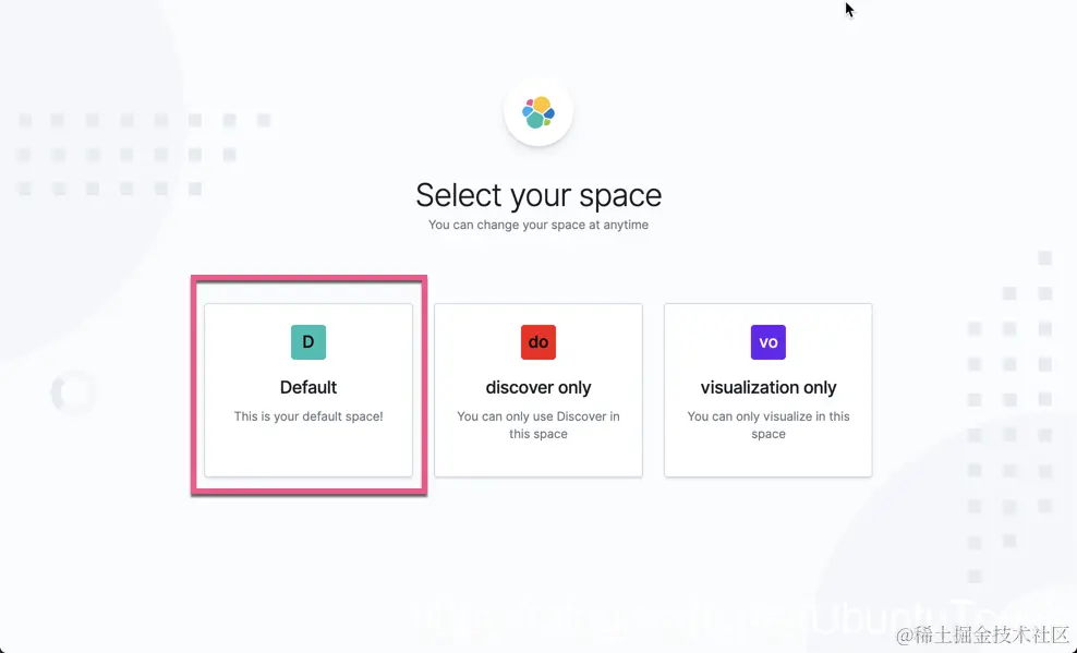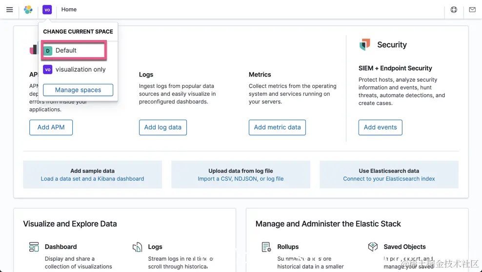 当我们设置好安全后,再次登录 Kibana。它提示我们需要输入正确的用户名及密码。我们使用 elastic 这个超级用户名来登录。我们选择 Default Space。我们使用这个 Space 来进行创建 role: