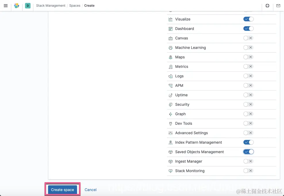 我们选择上面的四项。也是是在这个 Space 中,我们只能做可视化,dashboard,并可以对 index 进行管理和对保存的 objects 进行管理(导入及导出 objects)。点击上面的 Create space 按钮:
