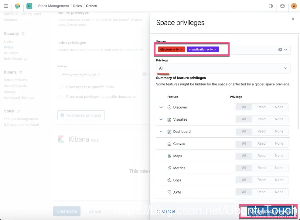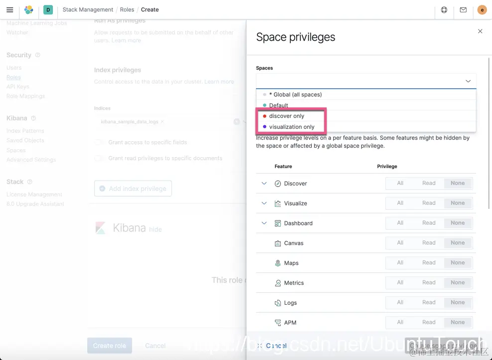 我们首先可以参考之前的文章 “Kibana:为不同的用户生成不同的 Space” 来创建两个不同的 Kibana 用户界面:visualization_only 及 discover_only。