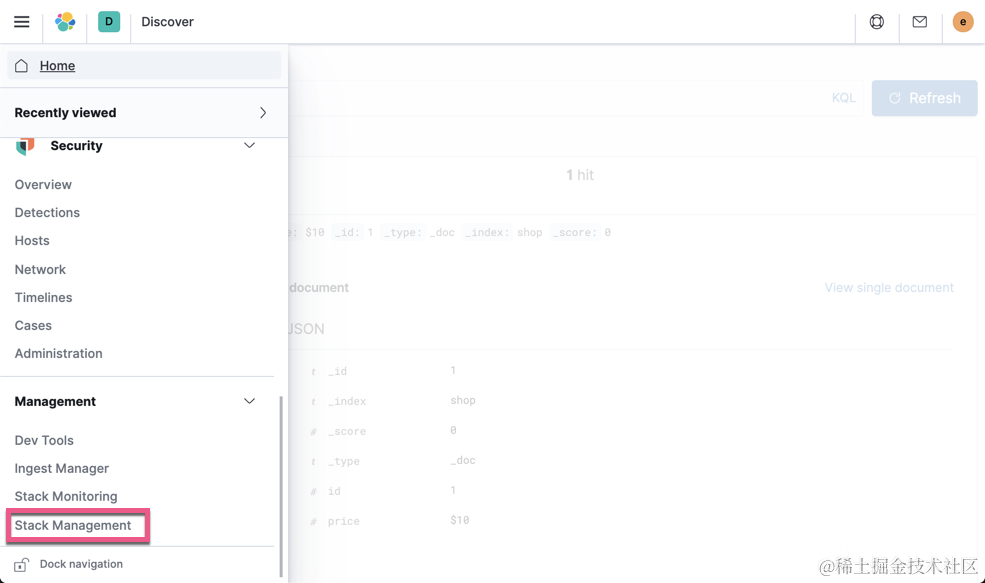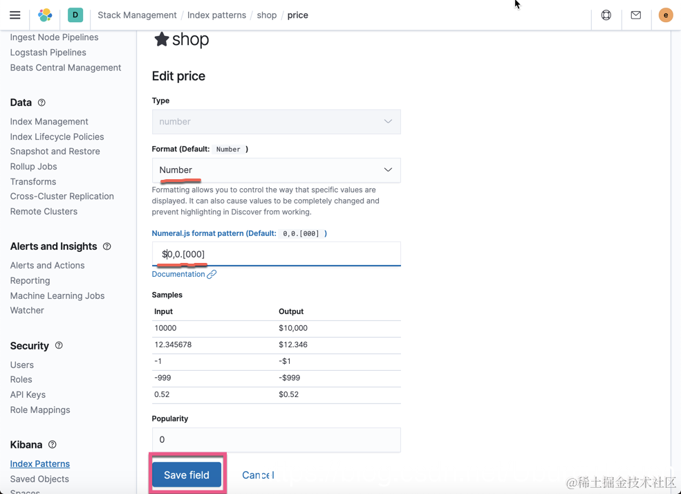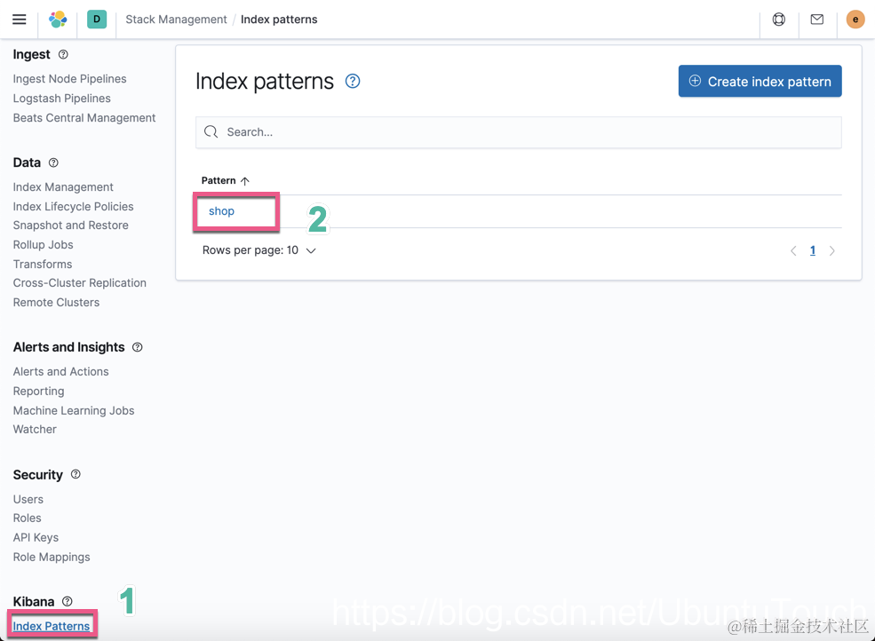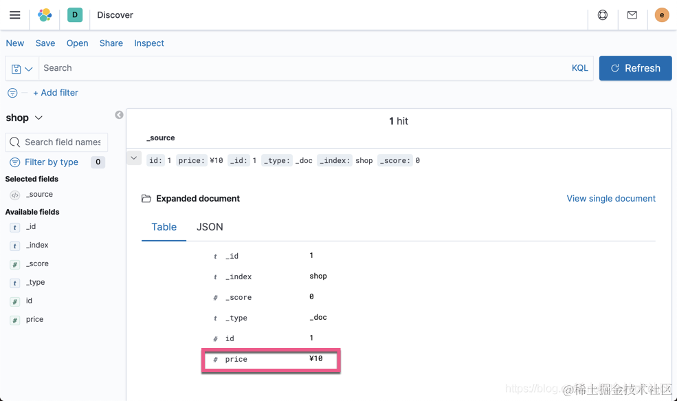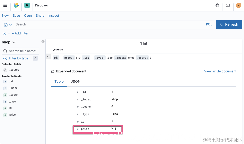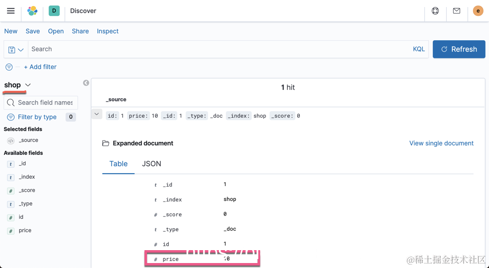 在 Kibana 的 console 打入上面的指令,我们就可以创建一个叫做 shop 的索引。我们接着为它创建一个 index pattern,并在 Discover 中进行展示: