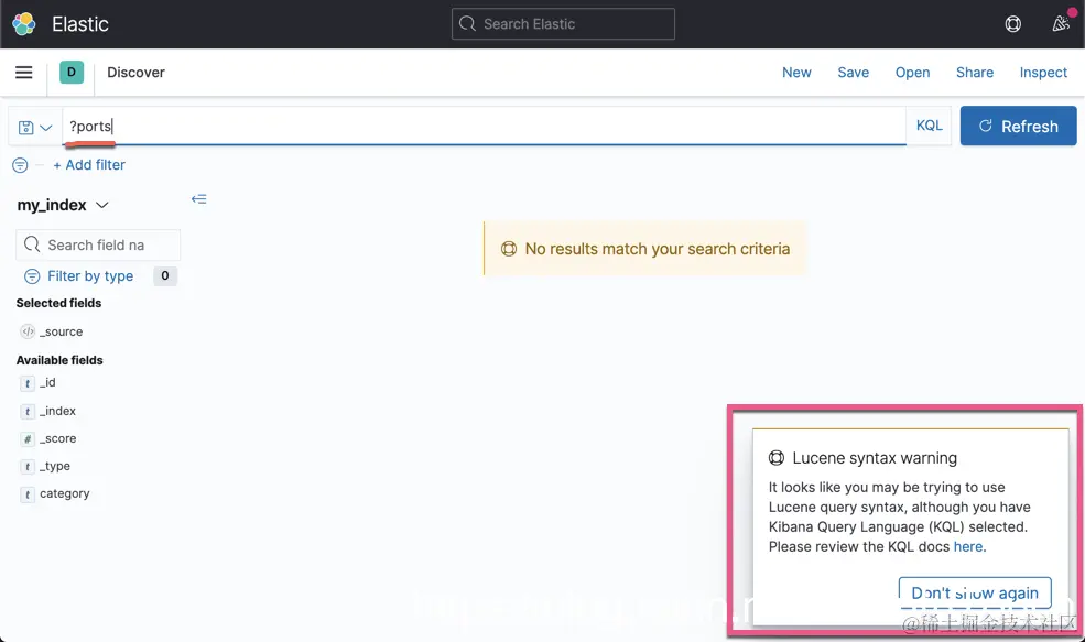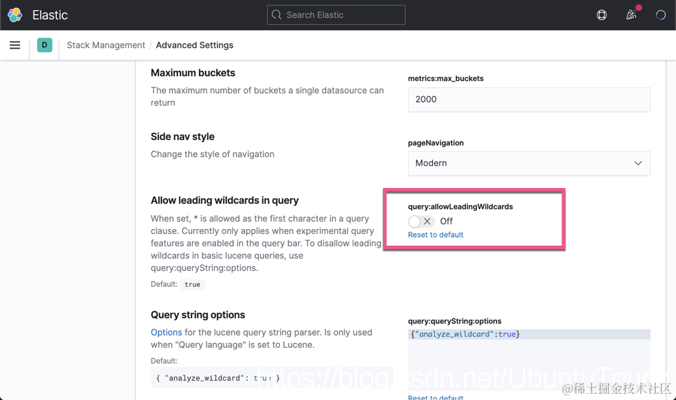 这样的查询在 Elasticsarch 中非常昂贵,一方面是 regexp 搜索本来就慢,代价很高,加之前置通配符查询,这样可能使得你的 Elasticsearch 非常繁忙 (如果你的数据量很大的情况下)。对于很多用户来说,可能希望避免这里的查询。我们可以在 Kibana 中来禁止这类的查询。请记住,尽管 Kibana 是两种查询语言:KQL 和 Lucene,所以你需要同时禁用两者。