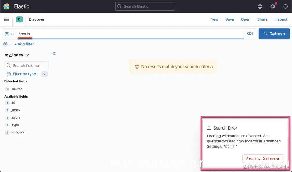 Kibana 搜索模块涵盖的一项搜索功能是可以在搜索中使用通配符。 但是通配符是要运行的极其昂贵的查询,尤其是前置通配符。 因此,你可能要考虑禁用前导通配符,以避免有人使用它们。在我之前的文章 “Elasticsearch:正确使用 regexp 搜索” 中,我已经详述了避免使用前置通配符查询。具体来说就是如下类型的查询: