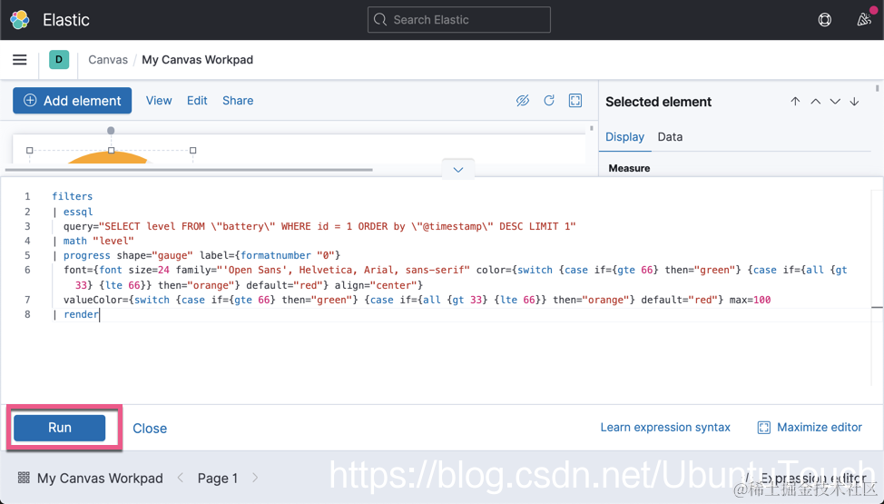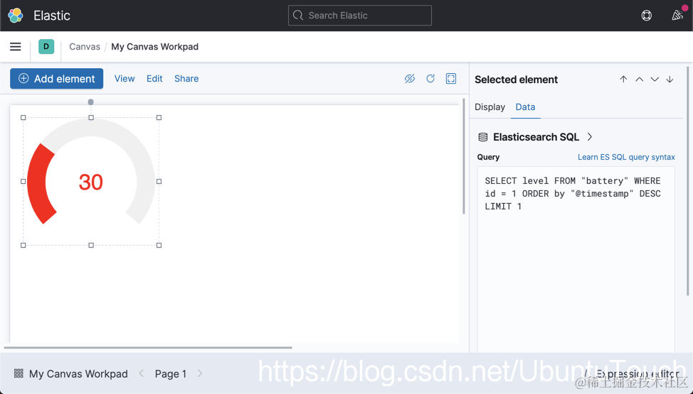 在上面,我们从 battery 索引中获取数据。请注意上面的 query 语句。它获取 battery 索引中的最近一条数据来做展示。当 level 大于 66 时,显示 green;当 level 大于 33 而小于 66 时,显示 orange 颜色;当 level 为其它的值时,显示为红色。