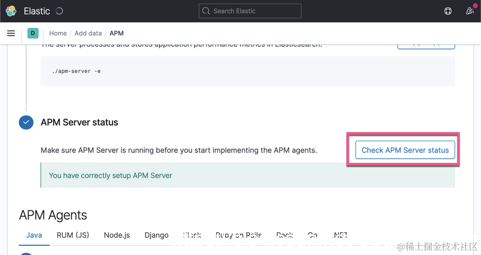 点击上面的链接来查看 APM 服务器是否已经运行并连接到 Elasticsearch。
