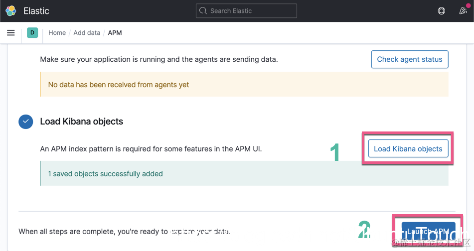 一旦做好了上面的配置,我们可以打开 Kibana 的 APM 应用。如果这是你第一次访问 APM 应用,请首先单击 “添加APM” 按钮,然后单击 “加载Kibana对象” 按钮: