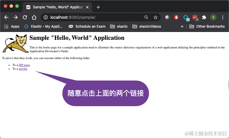 在上面我们发现有一个新的叫做 tomcat_hello_world 的服务。我们在 sample 网页上随意点击如下的两个链接:
