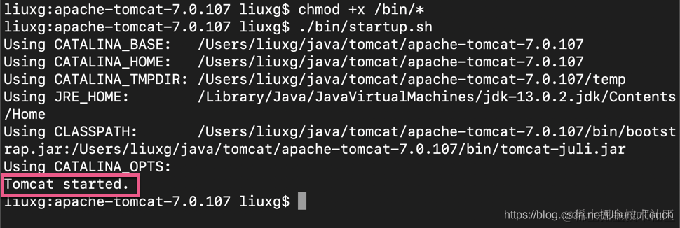 5)使用 $ ./bin/startup.sh 运行 Tomcat。