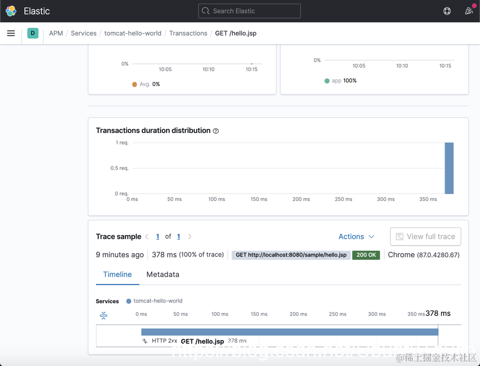 我们可以看到在 sample 应用中的两个接口的 transaction。点击上面的 “GET /hello.jsp” 接口: