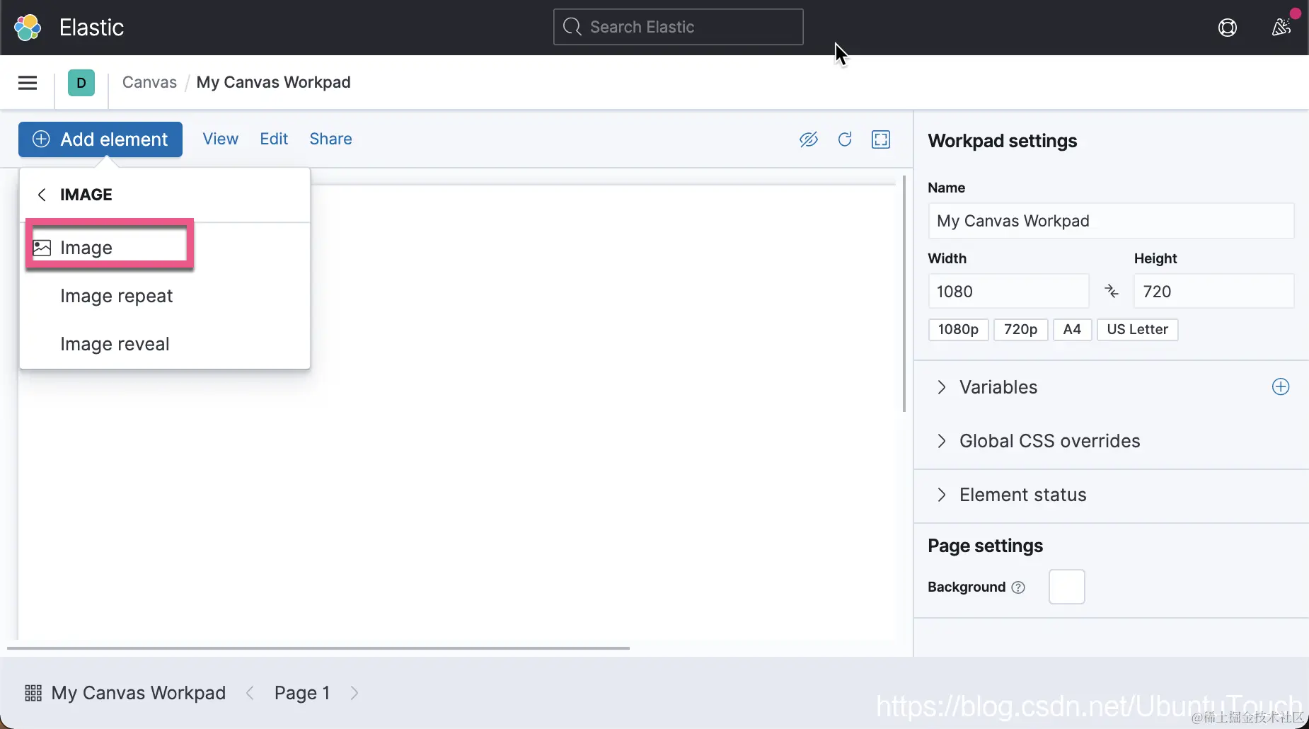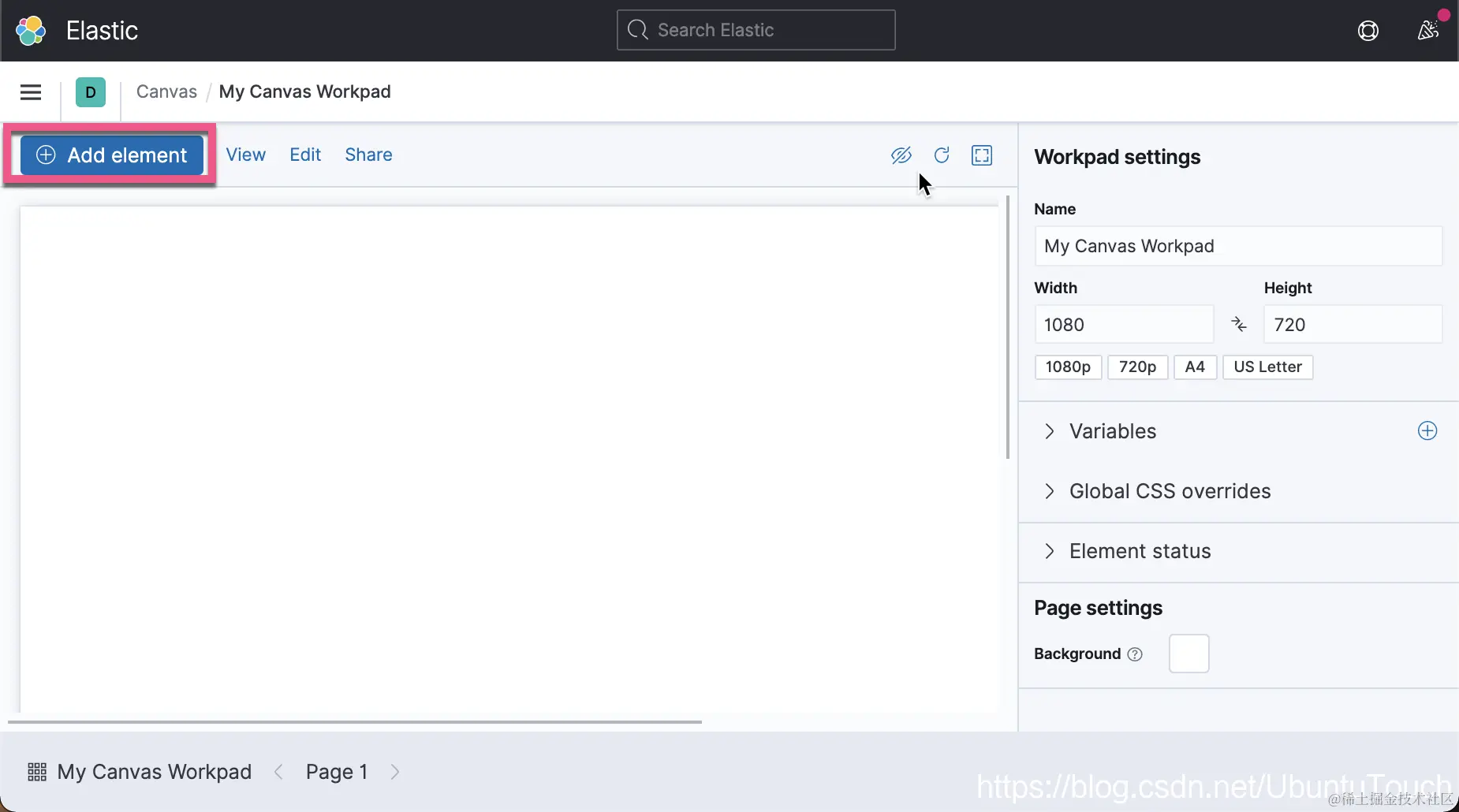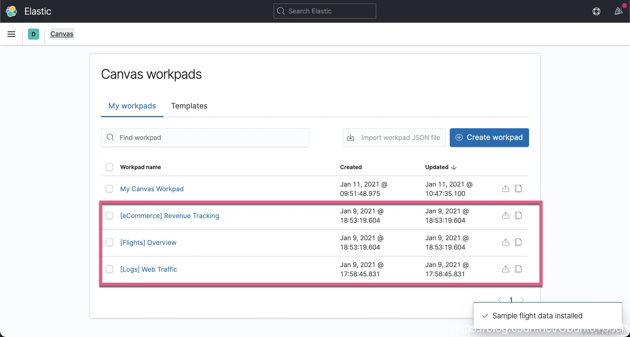 - 在 “Canvas” 页面上,单击 “Create workpad”。