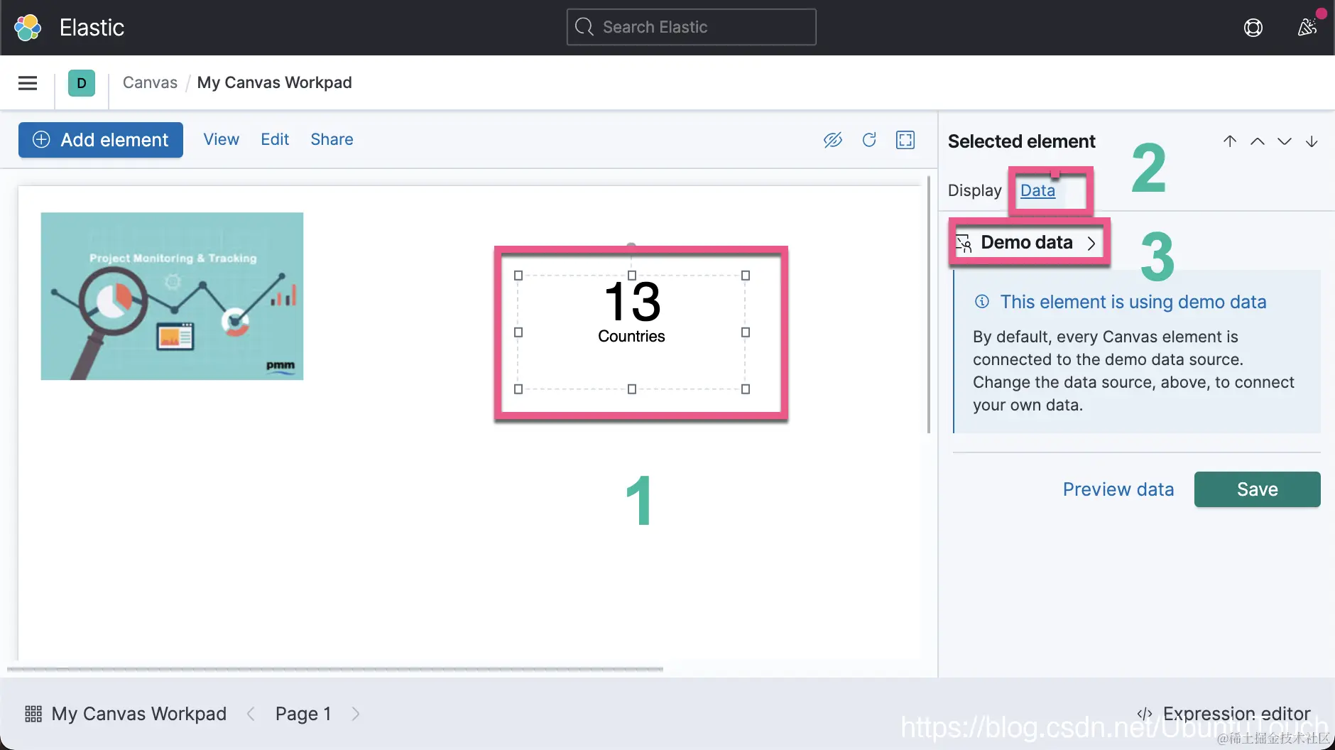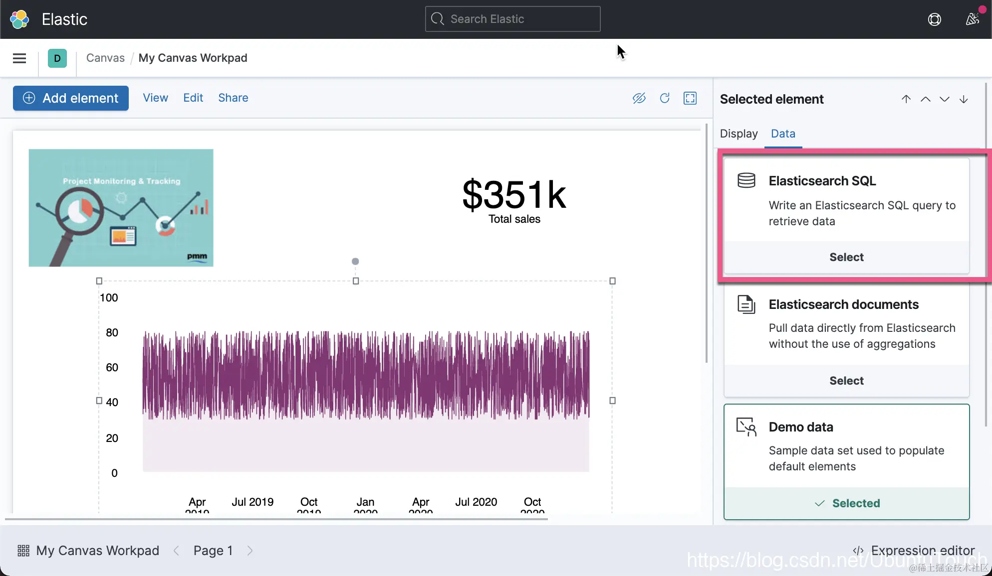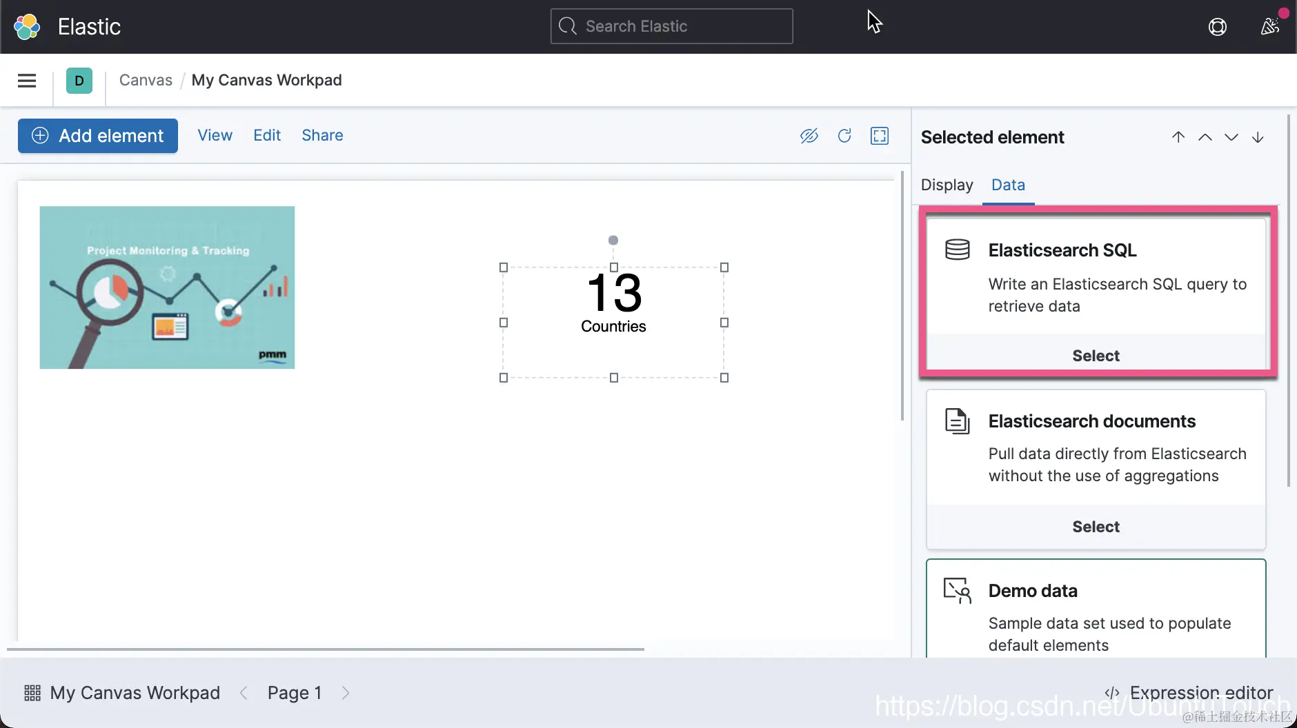 2)要将元素连接到你自己的数据源,请确保已选择该元素,然后单击 Data > Demo data > Elasticsearch SQL。